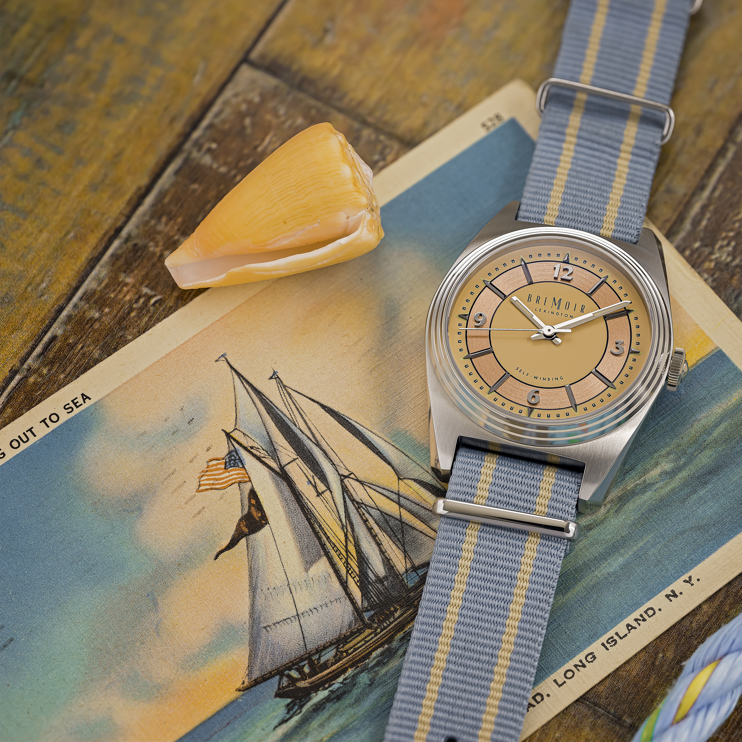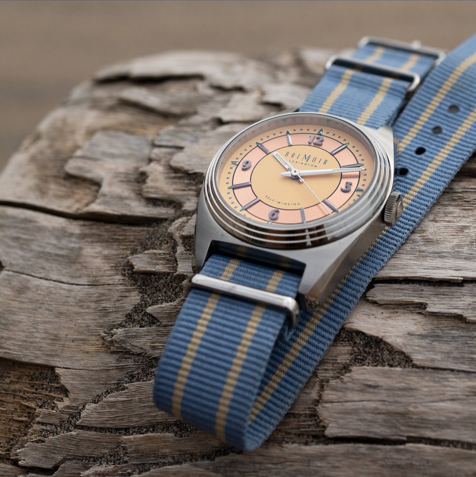 Inspired by the sand, sea and sky of a Montauk, N.Y. dawn. The unique, pastel color of this dial hovers somewhere between yellow and orange. Its navy blue minute markers and font give these design elements beautiful contrast and the brushed, copper chapter rings sets it on fire. Paired with a baby-blue, Nubuck strap, this watch also includes a complimentary NATO strap. It’s the choice for people who love summer vibes, no matter what season it is.
